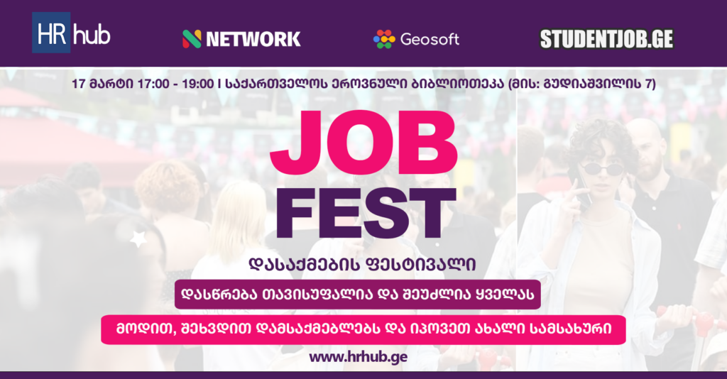 HR hubის ორგანიზებით, 17 მარტს, თბილისში, ეროვნული ბიბლიოთეკის საგამეფონო დარბაზში, (მის. ლადო გუდიაშვილის 7) 17:00-19:00 სთ-ზე,ყოველწლიურიდასაქმების ფესტივალი გაიმართება, სადაც წარმოდგენილი იქნება დამსაქმებლის ბრენდები აქტიური ვაკანსიებით.